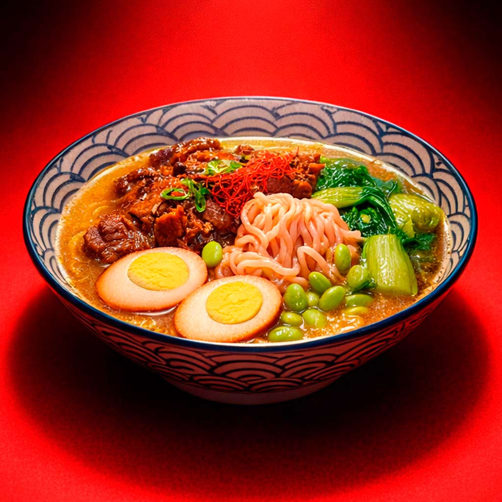 Tallarines con carne de res estofada, anís estrellado, hoja de laurel, chile seco, salsa de soja, huevo