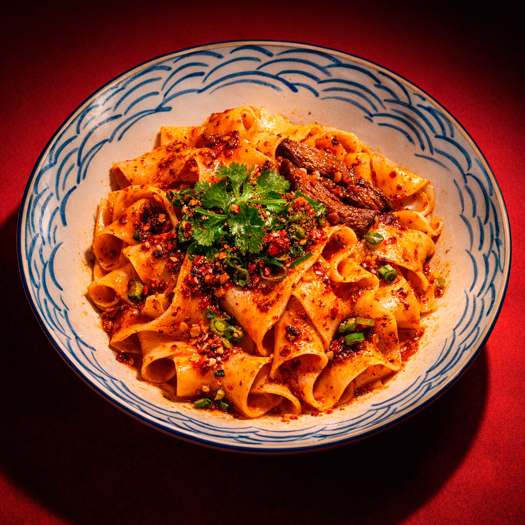 Tallarines con ternera, salsa picante, cebollín fresco y  cilantro