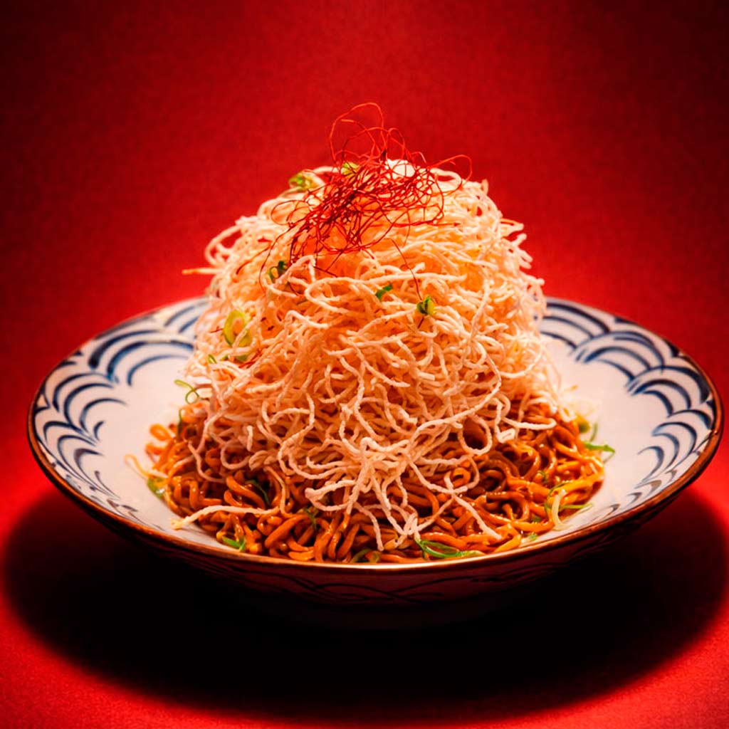 Tallarines crujientes por arriba y bien de nuestra salsa a base de salsa de soja fermentada, cerdo y cebolla