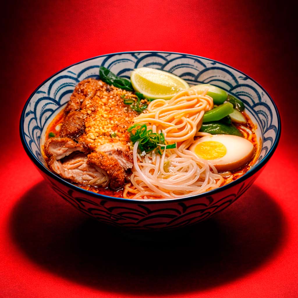 Tallarines con pollo al estilo Thailandés y curry, salsa satay, ajo, huevo