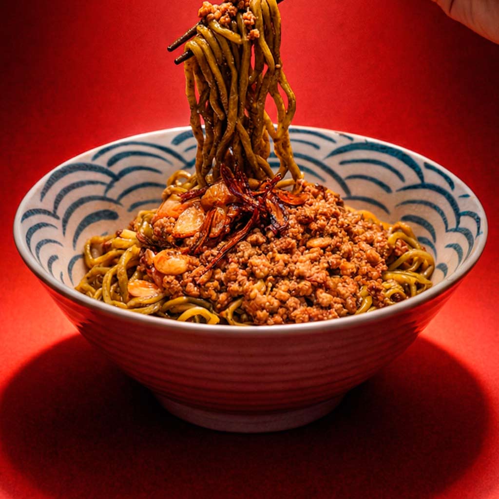 Crispy noodles on top and plenty of our sauce made with fermented soy sauce, pork, and onion.
